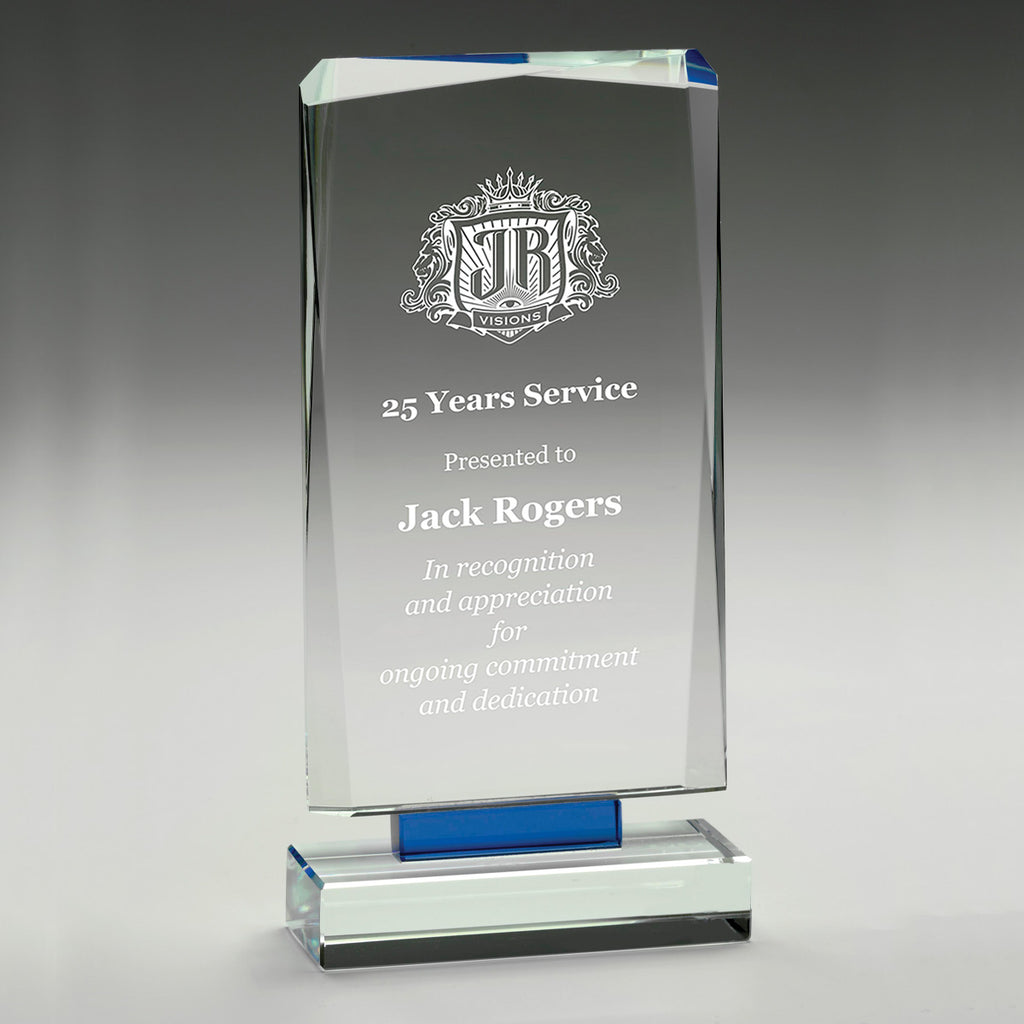 Elevate your engraving with the Blue Mirage Glass Award, featuring a sleek faceted design and a blue offset base. With 3 sizes available and presented in a gift box, these high-quality glass awards are perfect for corporate recognition, showcasing your organization's brand or logo.