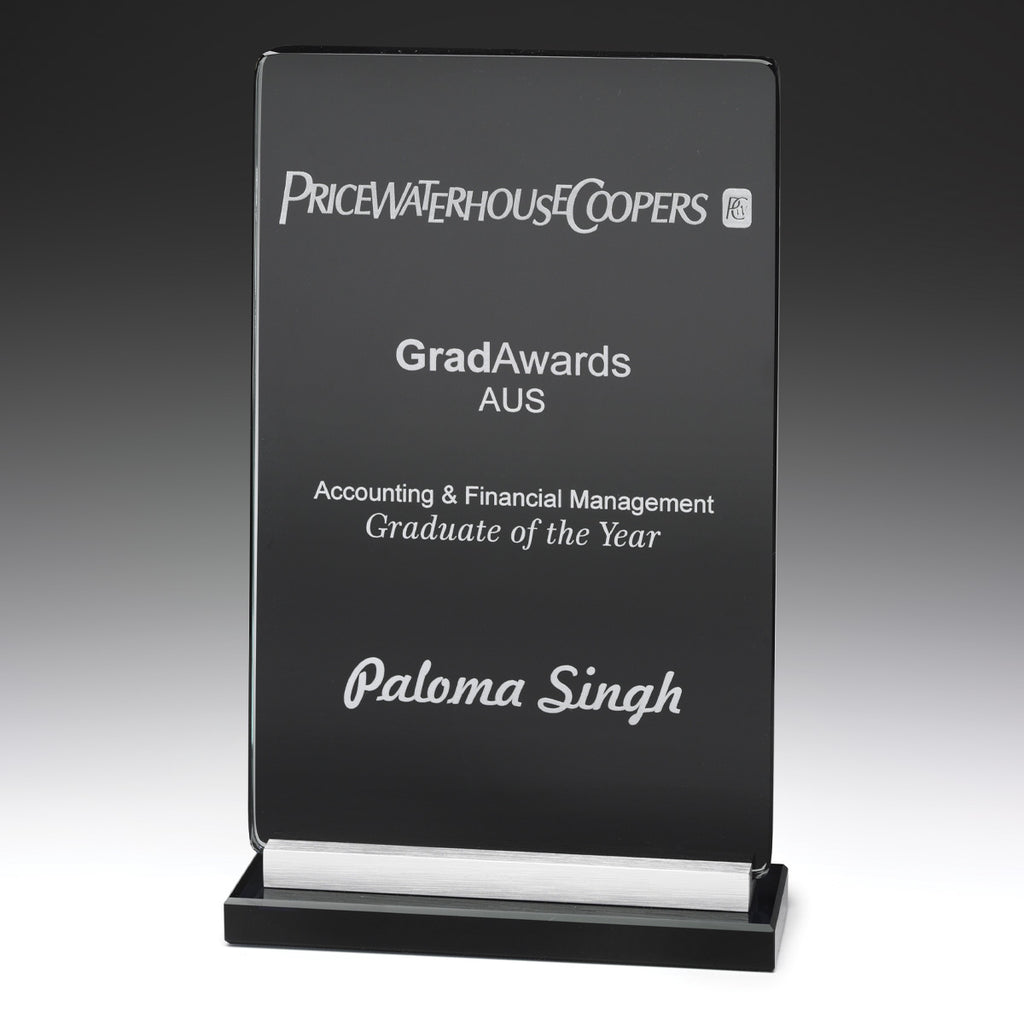 Featuring an impressive design, the Glass Black Broadside is guaranteed to make a strong impact at any award ceremony. The incorporation of a black panel in the award's design enhances the precision of the engraving, while the brushed metal base element adds to its overall aesthetic appeal. This product also comes in a convenient Gift Box packaging.