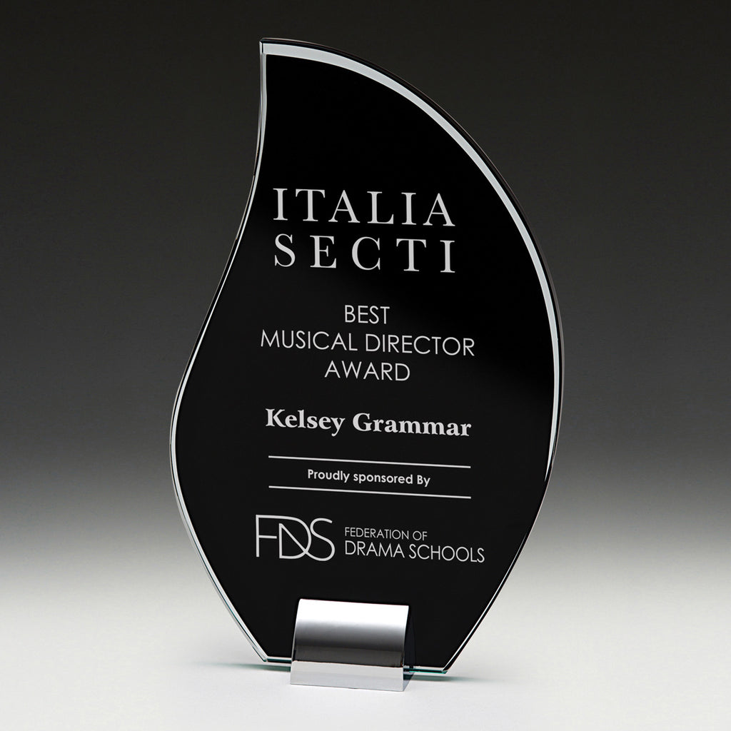 Elevate your award ceremonies with the Harmony Glass / Metal Award featuring patented black panels for precise engraving and shiny metal bases. Gift boxes are included for a complete presentation.