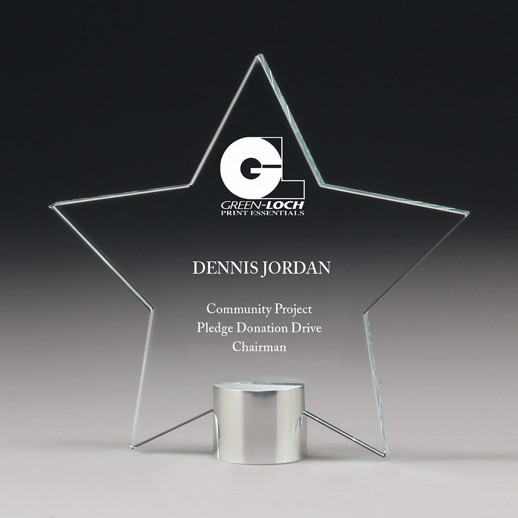 The North Star showcases a distinctive metal base and a universal glass award in the shape of a star. Its star-shaped design offers a versatile theme that is perfect for corporate events or competitions in various industries. This award is just one of many options available in our wide selection of corporate awards, including those made of acrylic, crystal, and glass.