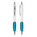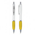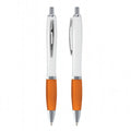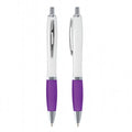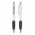 Retractable plastic ball pen with a white barrel, a frosted translucent soft-touch grip and shiny chrome trim.