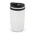Sleek BPA-free 300ml double wall coffee cup which has a stainless steel outer wall and a polypropylene inner wall. It will keep drinks hot or cold for longer and has a secure screw on lid with a splashproof flip closure. The white and black cups laser engrave to a shiny steel finish and the stainless steel cup laser engraves to a natural etch. Vento has a soft non-marking base and can be presented in an optional black gift box. This product is not dishwasher safe and handwashing is recommended.